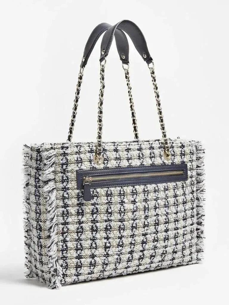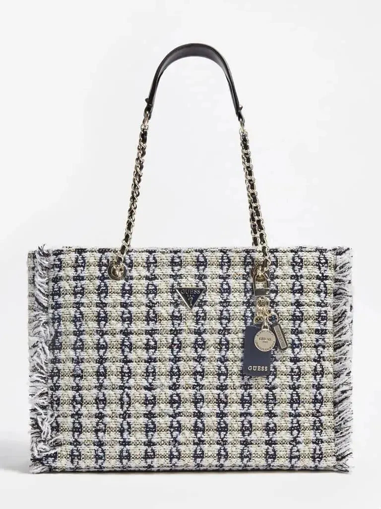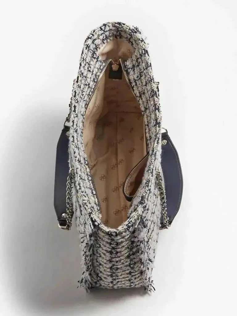 Le Sac Guess Cessily réunit tous les éléments de la mode élégante. Sa matière mélangée laine et polyester offre un effet tweed unique et sa grâce se voit rehaussée par des pièces métalliques couleur or pâle. Son logo triangle en métal sur le devant le rend encore plus luxueux. Avec de nombreuses poches intérieures et une poche zippée au dos, ce sac shopping chic assurera des tenues stylées pour toutes les occasions.