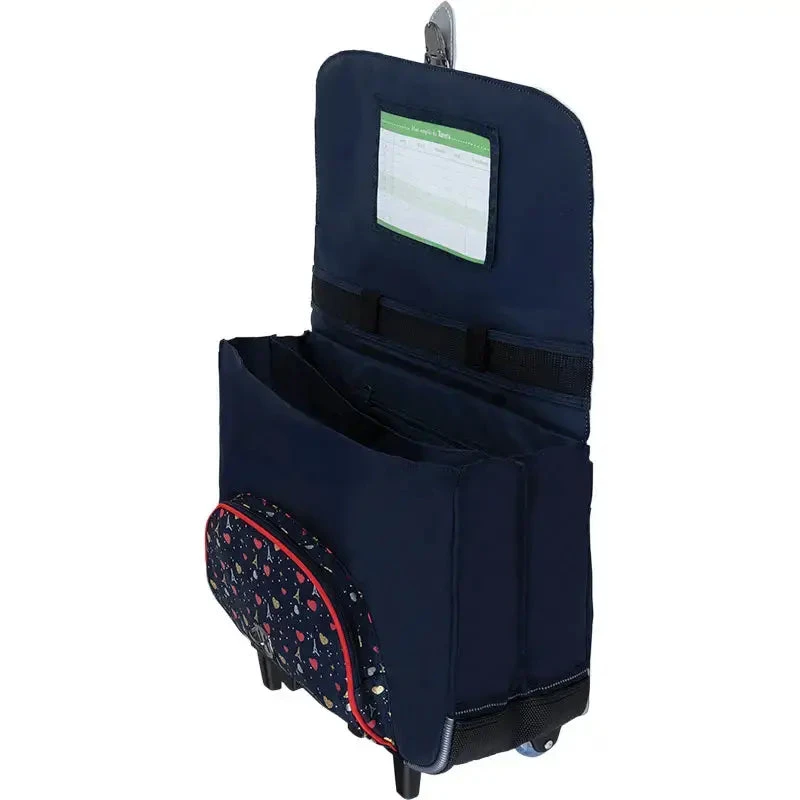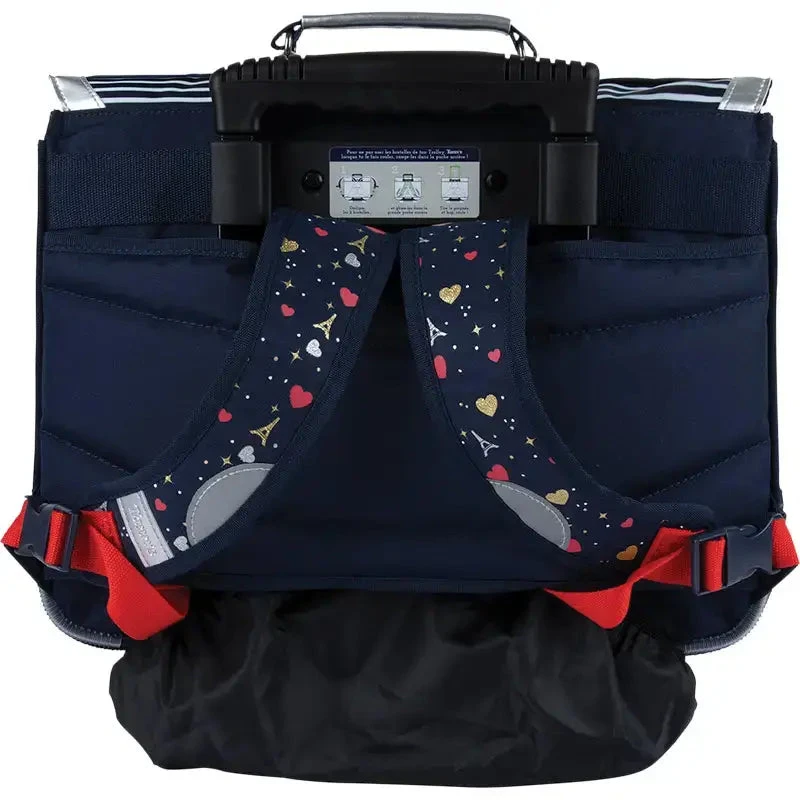 Le Cartable Roulettes Tann’s « Emilie » est conçu pour les **élèves du CP au CE2**, alliant **style parisien, robustesse et fonctionnalités modernes**. Son motif rayé bleu marine, accompagné d’un **patch cœur en bouclette avec fil lurex** et d’une **sérigraphie dorée et argentée sur la poche**, apporte une **touche chic et raffinée**.