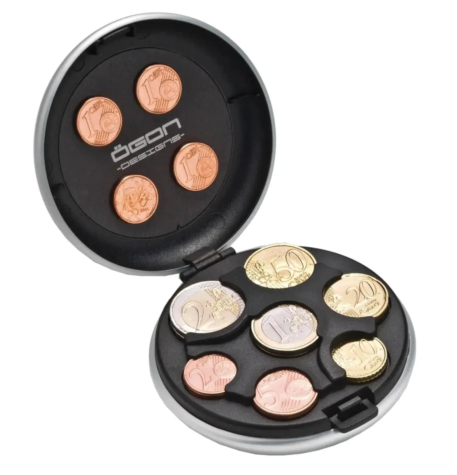 Contenance : environ 20€ en monnaie (environ quarante pièces) soit 5 pièces par emplacement + couvercle aimanté pour les pièces de 1 centime.