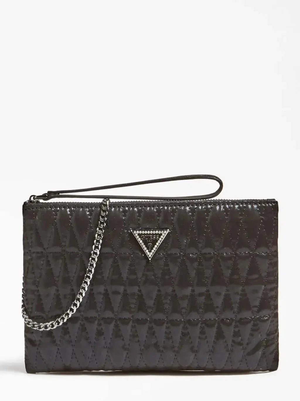 La Pochette Pixi Laminée Capitonnée de Guess est une pièce élégante et originale de la nouvelle collection Hiver 20. Son design éblouissant offre une belle allure avec son effet capitonné et de longues tirettes. Elle se ferme à l’aide d’une pochette zippée et peut être portée à l’épaule ou à la main grâce à sa bandoulière à chaîne. Des pièces métalliques couleur or pâle et un logo triangulaire frontal en métal avec strass apportent une touche de luxe et de raffinement à cette pochette. Disponible sur Melisac.fr.