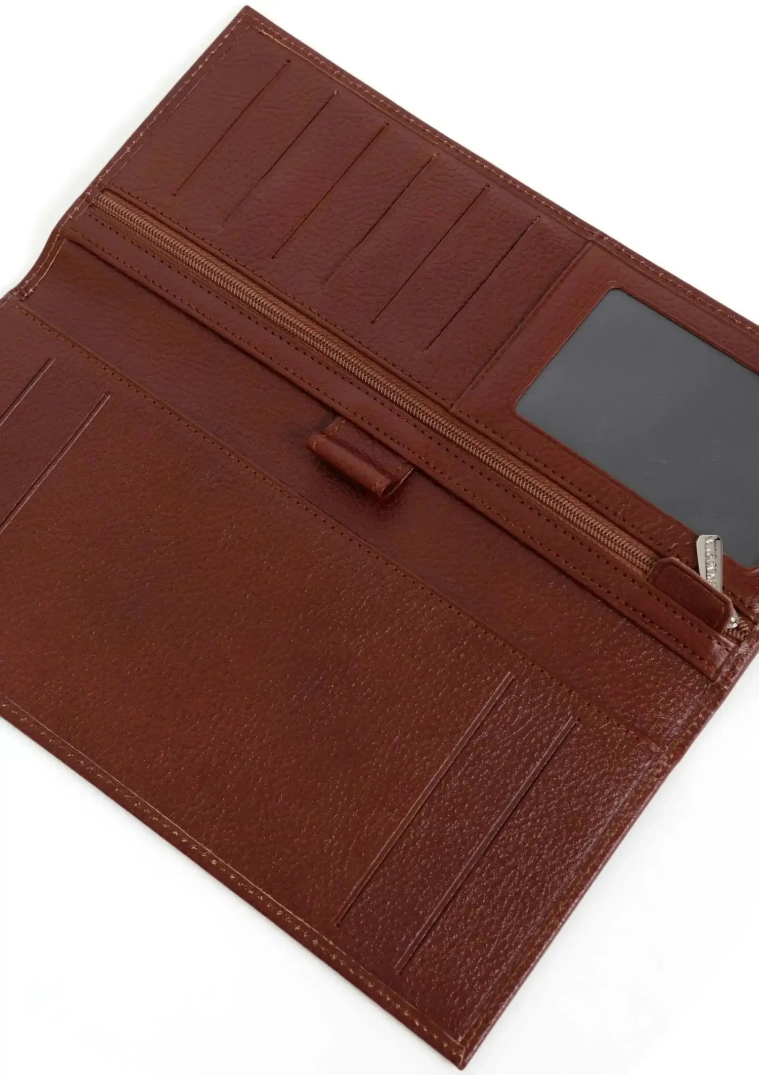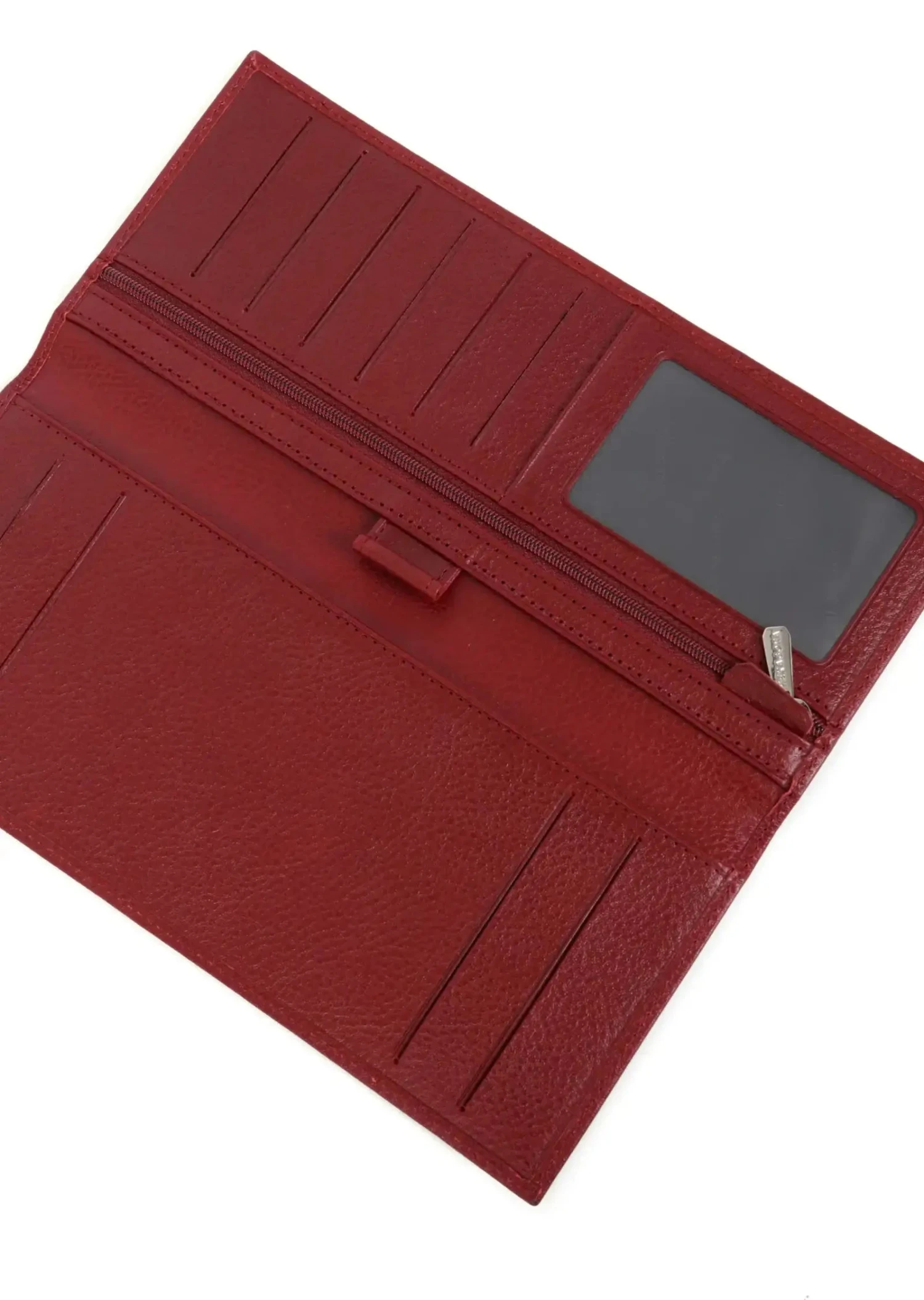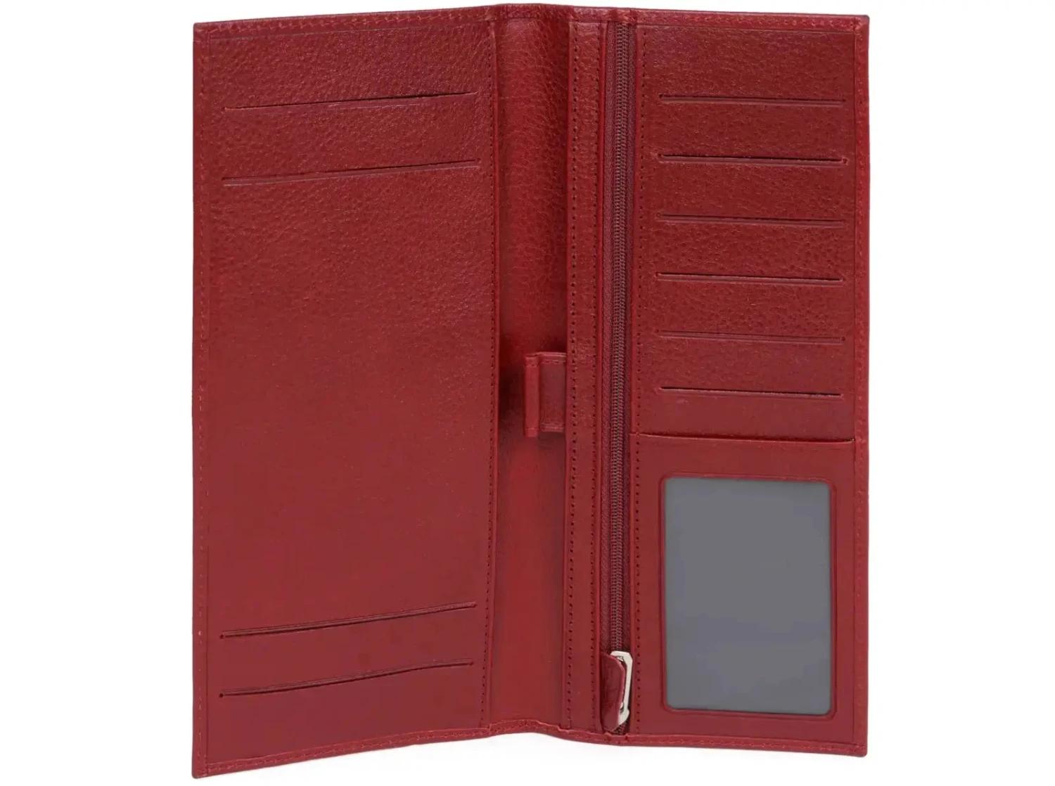 Cet accessoire polyvalent offre un intérieur bien organisé, comprenant un volet, un porte-monnaie zippé, trois poches plates (dont une transparente), six emplacements pour cartes, un espace dédié au chéquier et un compartiment pour stylo. Ses finitions argent brillant et son format raffiné le rendent idéal pour une utilisation quotidienne élégante.