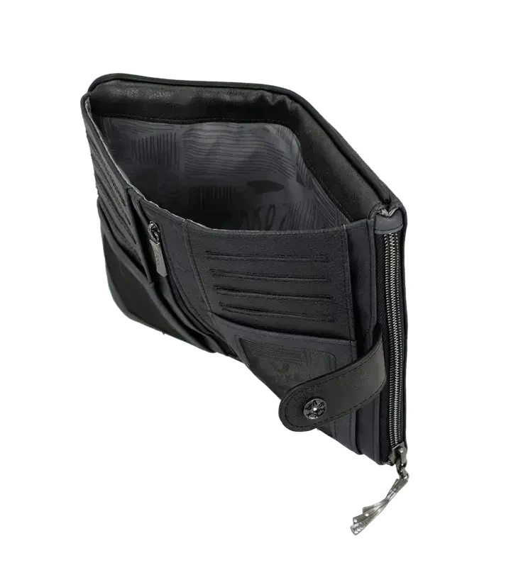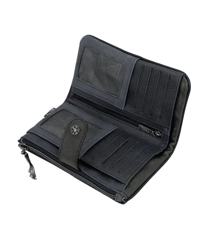 FabriquĂ© dans une matière souple de couleur bleu marine, ce portefeuille de grande taille est Ă la fois fonctionnel et Ă©lĂ©gant. Ses compartiments principaux offrent un espace gĂ©nĂ©reux pour vos billets, cartes et documents, tandis que la fermeture Ă©clair sur le dessus donne accès Ă un porte-monnaie pratique. L’intĂ©rieur entièrement doublĂ© garantit la sĂ©curitĂ© de vos effets personnels.