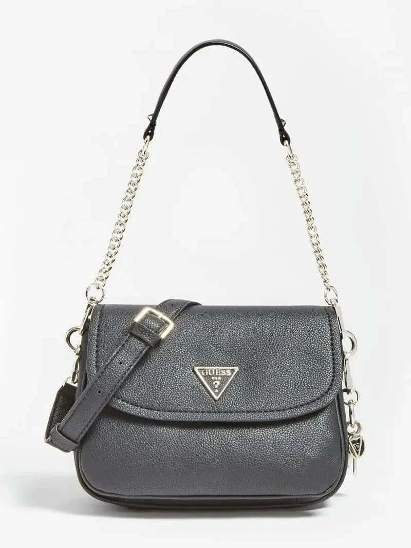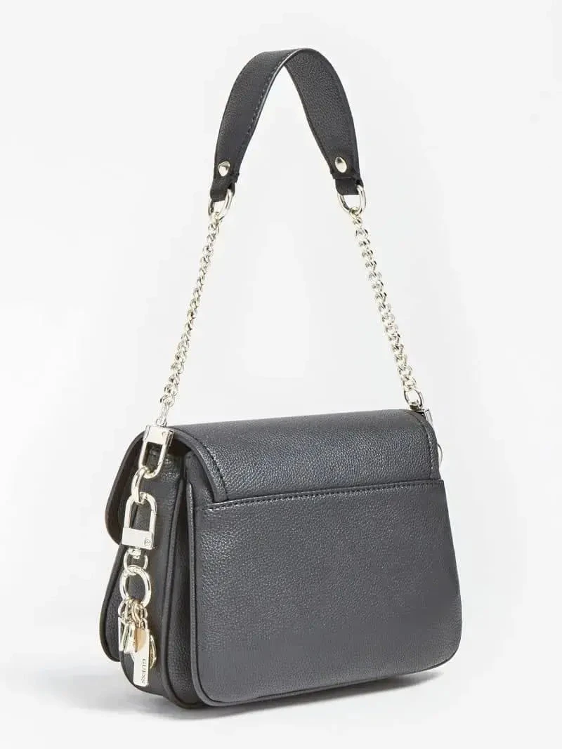 Le Sac bandoulière Guess Destiny de la nouvelle collection est raffiné et sophistiqué. Parfait pour un usage quotidien, ce sac de taille moyenne à rabat est doté de 3 compartiments et de poches plates ainsi qu’une poche intérieure zippée. L’anse en chaîne et la bandoulière réglable et amovible sont en métal couleur or pâle. La breloque logo sur la base de l’anse apporte une touche finale d’élégance et de sophistication. Disponible exclusivement sur Melisac.fr.