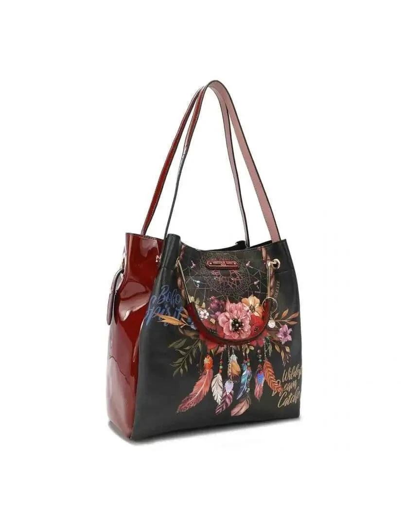 Le Sac Nicole Lee de la ligne « Bohemian Black » est un mélange luxueux de sophistication intemporelle et d’éléments bohèmes modernes. Offrant des poignées courtes et des poignées longues pour un port à l’épaule, plus une doublure logo premium, l’extérieur de magnifiques motifs exclusifs NL et des anses en métal et en cuir végan verni. Avec sa fermeture à glissière et son accroche-clés, le « Bohemian Black » est parfait pour un usage quotidien.