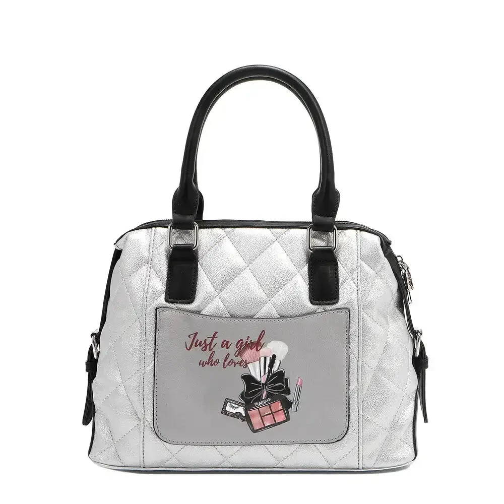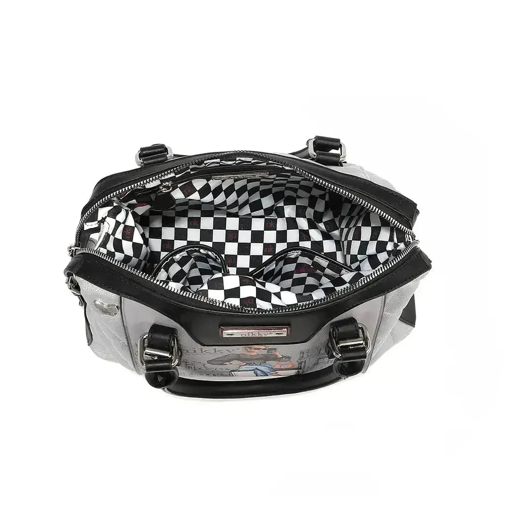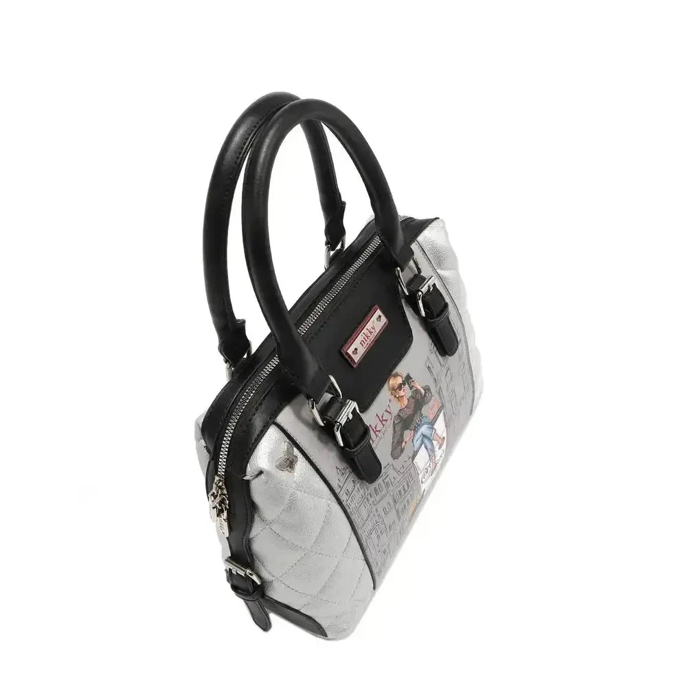 Des coutures matelassées délicates et un imprimé signature Nikky exclusif ornent le devant du sac, tandis qu’une plaque logo dorée renforce son allure luxueuse. -